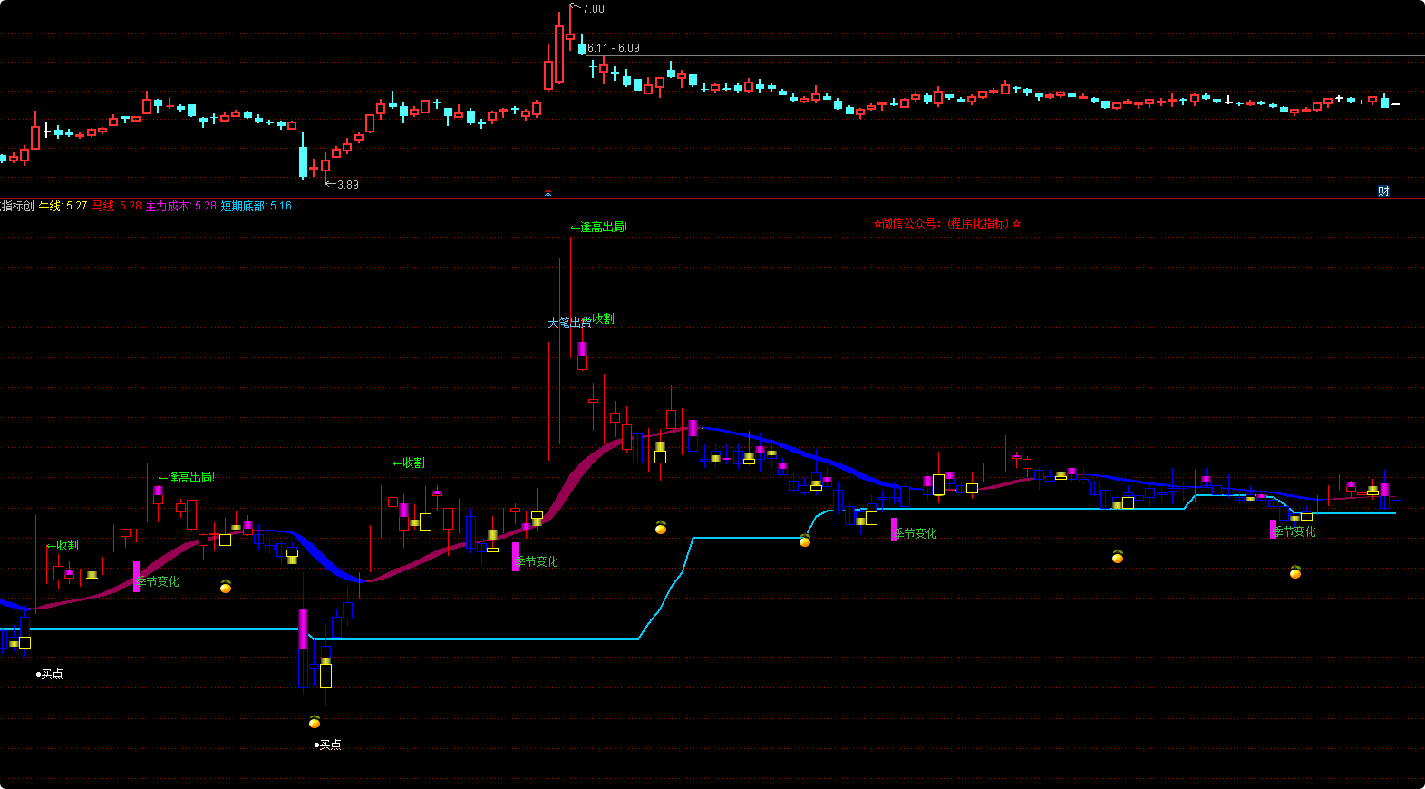 DRAWTEXT_FIX(1,0.62,0,0,'☆微信公众号:(程序化指标) ☆'),COLORRED;