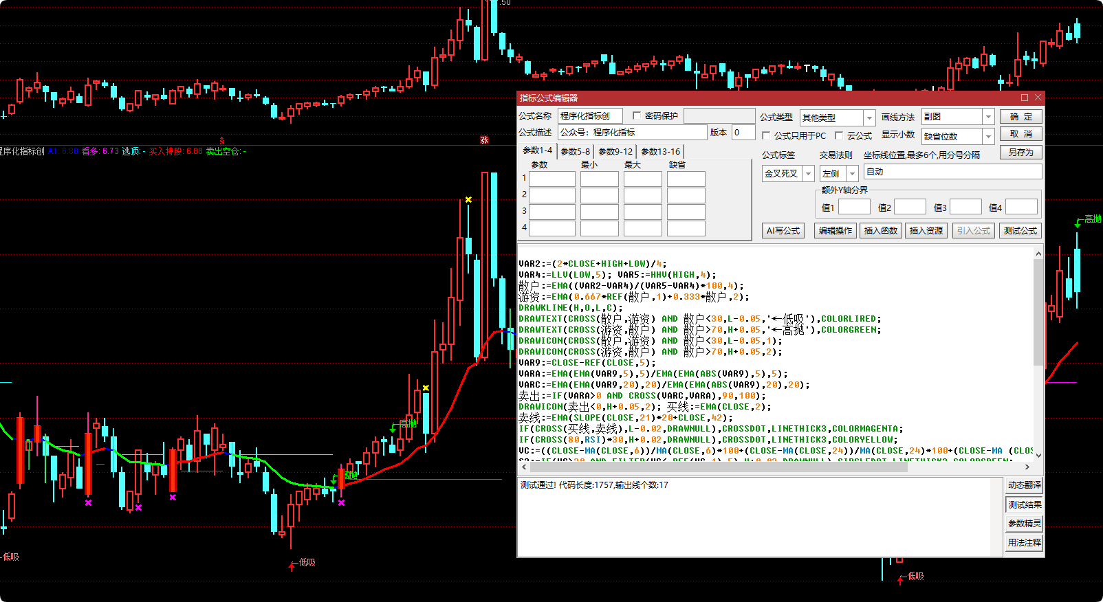 IF(CROSS(买线,卖线),L-0.02,DRAWNULL),CROSSDOT,LINETHICK3,COLORMAGENTA;